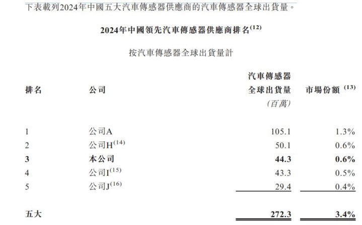 2024年中国汽车传感器出货量TOP5厂商合计出货数量为2.72亿件,占全球市场份额3.4%。
