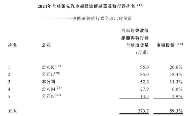 在全球汽车超声波传感器及执行器领域,以出货量计,公司K排名TOP 1,出货量达9500万件,市场份额20.6%,公司K疑为博世;公司L第2,出货量8500万件,市场份额18.4%,公司L疑为法雷奥;公司M第4,出货量2790万件,市场份额6%,公司M疑为村田制作所;公司N第5,出货量1350万件,市场份额2.9%,公司N疑为合肥晟泰克。