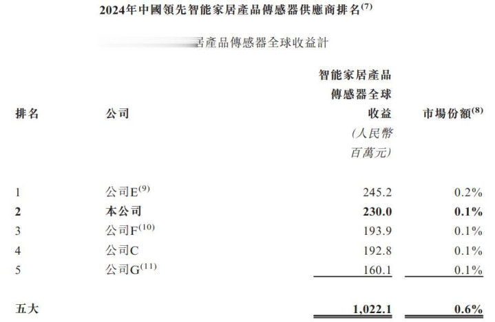 在智能家居产品传感器排名TOP 1 的国产公司E,营收2.45亿元,全球市场份额0.2%,招股书介绍公司E于深圳证券交易所上市,总部设于广东省深圳市,于2001年成立,在光学与光电领域拥有深厚 专业技术,业务涵盖三大领域:智能手机、智能汽车及新兴应用。