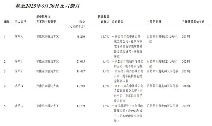 截至2022年、2023年、2024年12月31日止各個年度及截至2025年6月30日止六個月,各期间五大客户产生的营收分别为1.49亿元、1.78亿元、2.21亿元及1.1亿元,分别占同期总营收的39.5%、38.0%、35.7%及33.6%。