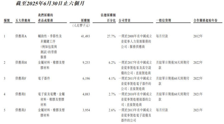 其中,截至2022年、2023年及2024年12月31日止年度以及截至2025年6月30日止六个月,奥迪威来自五大供应商的原材料采购分别为5320万元、7290万元、1.33亿元及7290万元,分别占同期采购总额的38.4%、35.0%、42.2%及43.3%。