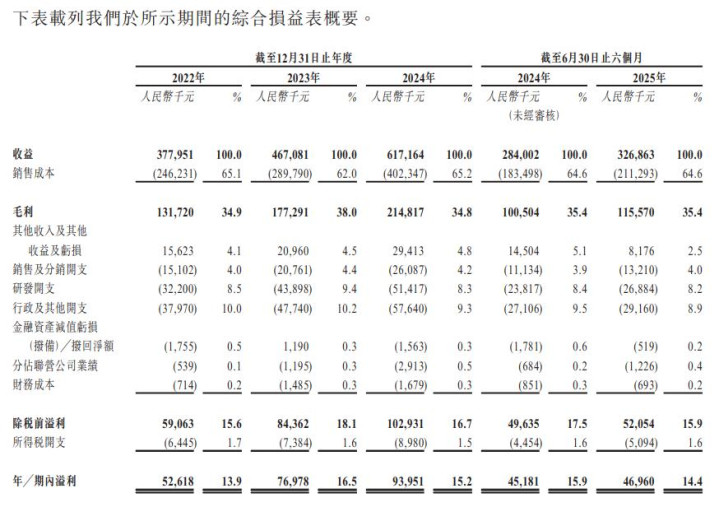 往绩记录期间,2022年、2023年、2024年营收分别为3.78亿元、4.67亿元、6.17亿元,复合年增长率为27.8%。2024年1-6月营收2.84亿元,2025年1-6月营收3.27亿元,增长15.1%。