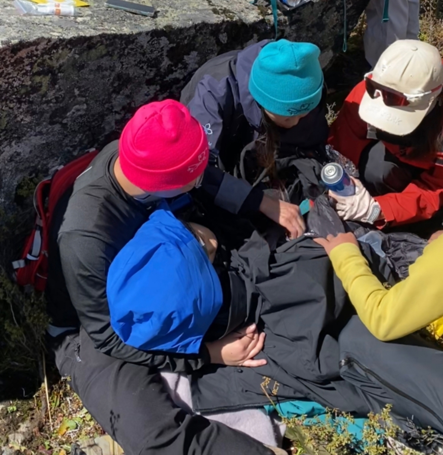 当日11时55分许,刘月娥、马雪倩两位医生在徒步途中,敏锐地发现一名女孩被一年轻男孩搀扶着艰难前行,步态踉跄、精神萎靡。出于急诊科医生的职业敏感,二人立即快步上前查看,通过观察面色(苍白)、判断意识(淡漠),触摸四肢末梢(湿冷)及桡动脉搏动(微弱),初步诊断女孩为急性高原反应,且已出现明显失温症状,生命危在旦夕。